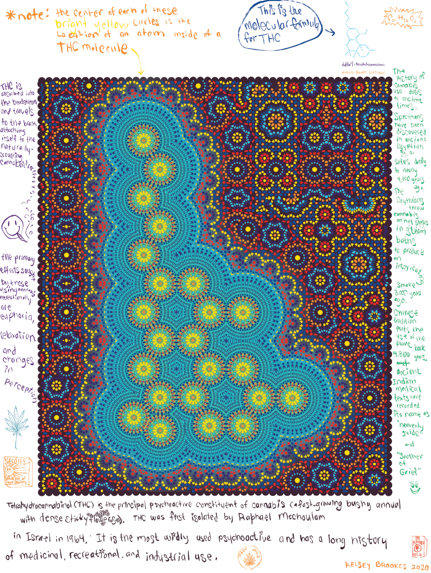 The art work is a drawing of a THC molecule. The center of each of the circles in the pattern is the location of an individual atom in the molecule. Around the perimeter of the main art work panel there are some notes about the physiological and psychological effects of THC . In addition I have added some doodles in the margins inspired this fascinating medicine. This same art work is available in green and purple editions.